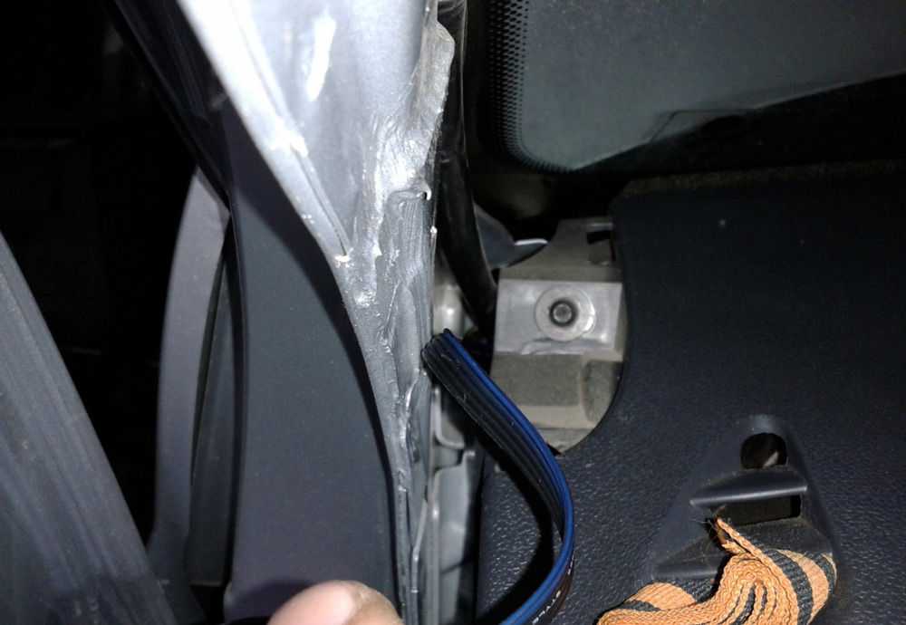 Переходим к непосредственному монтажу сигнализации. Изоляционной лентой обматываем кабели таким образом, чтобы обеспечить способность точек подключения устройства своевременно срабатывать при агрессивном воздействии на кузов снаружи. Такой подход может оправдать скрытность места (за накладкой) нахождения основного модуля системы. Злоумышленникам здесь будет тяжело к нему подобраться.
