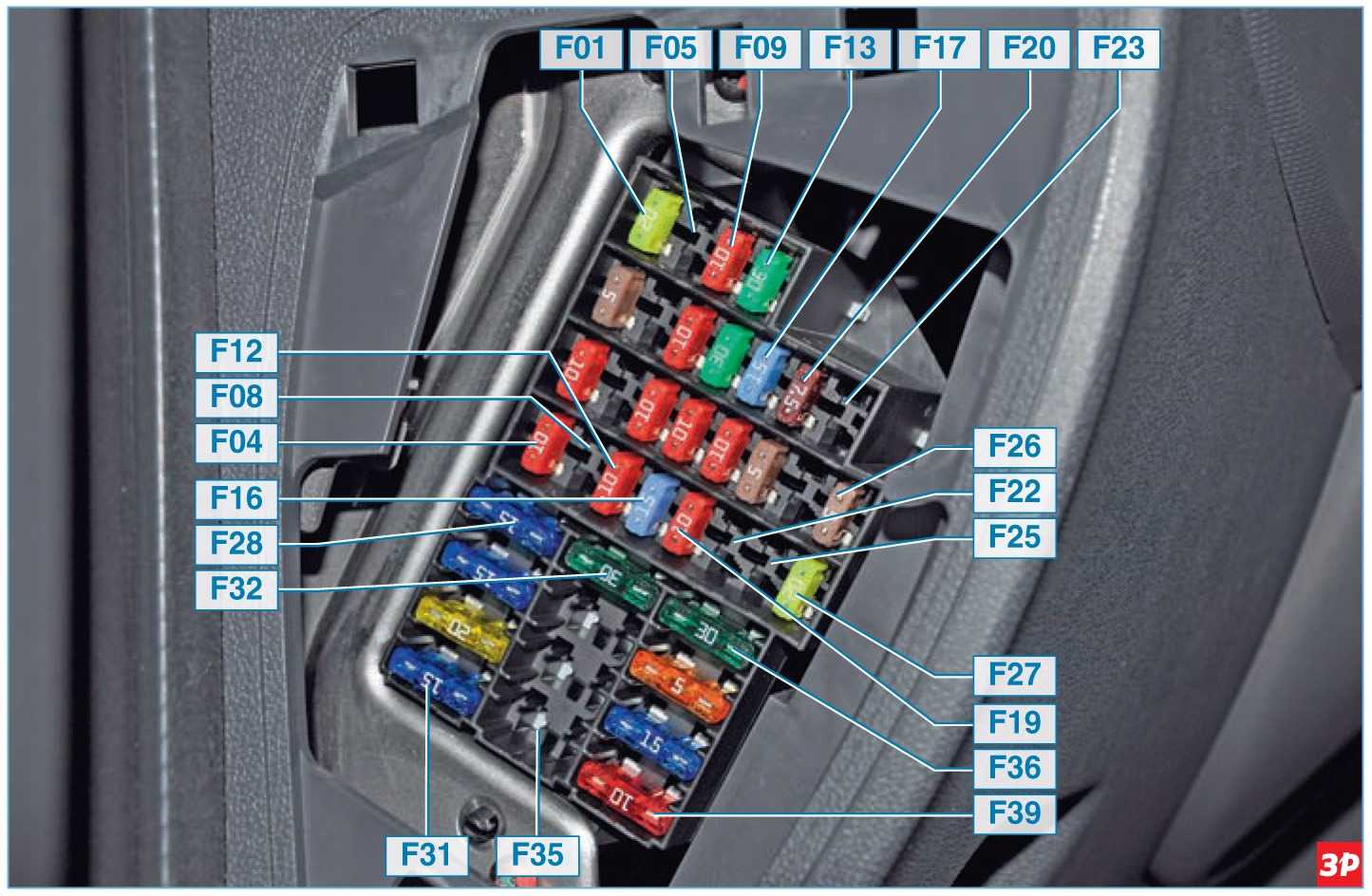 3) Как и в моторном отсеке на внутренней стороне крышки нанесена схема с назначением предохранителей и их расположением;