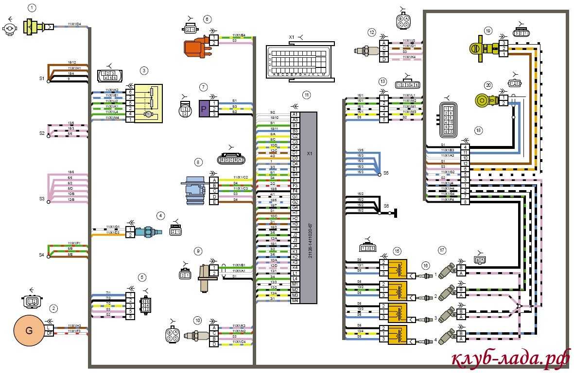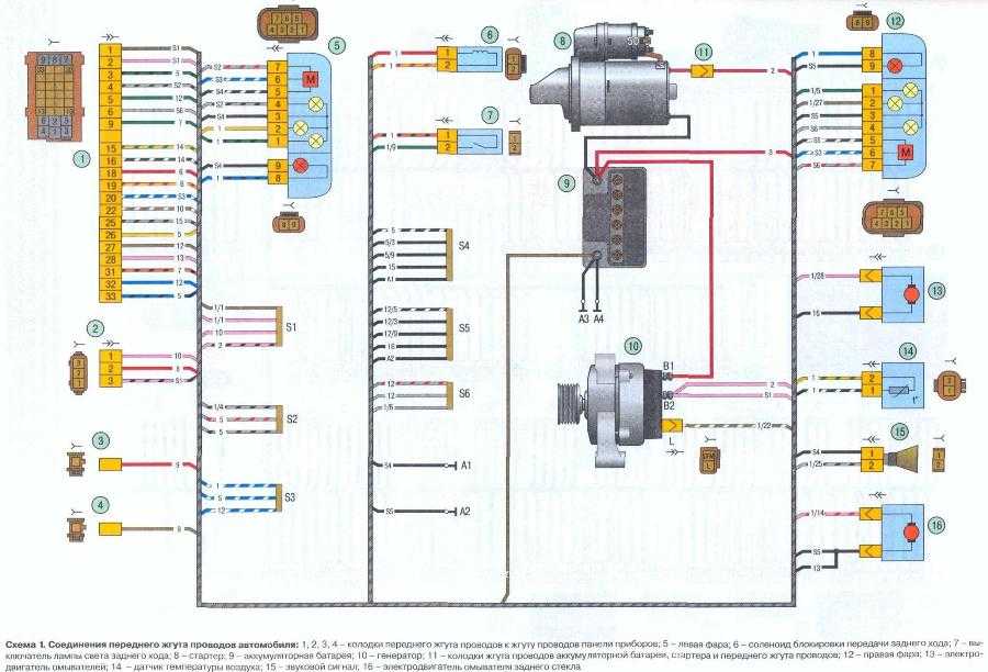 Генераторное устройство — этот элемент считается одним из главных, поскольку он позволяет обеспечить питанием все приборы и оборудование авто во время работы двигателя. Электросхема соединения переднего жгута Ваз , Ваз , Ваз 1,2,3,4- колодки переднего жгута проводов к жгуту проводов панели приборов; 5 — левая фара; 6 — соленоид блокировки передачи заднего хода; 7 — выключатель лампы света заднего хода; 8-стартер; 9 — аккумуляторная батарея; генератор; 11 — колодки жгута проводов аккумуляторной батареи, стартера и переднего жгута проводов; правая фара; электро-двигатель омывателей; 14 —датчик температуры воздуха; звуковой сигнал; 16 — электродвигатель омывателя заднего стекла.