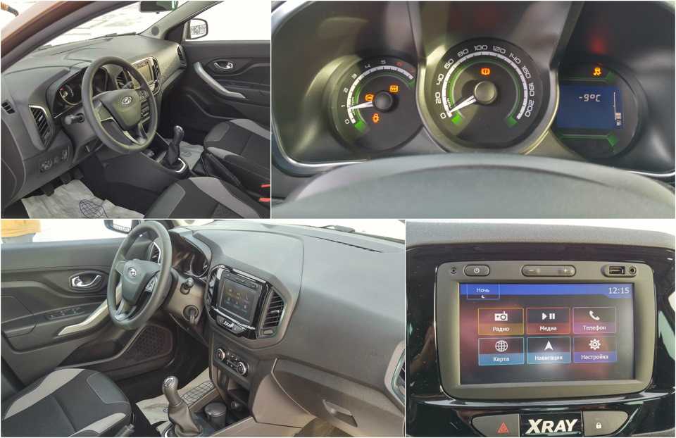 Что получает покупатель, выбравший данную версию Лады Х-Рей? Внутренний дизайн салона – достаточно неприхотливый, тисненый пластик и тканевая обивка сидений, однако выполнен он в полном соответствии с обновленным дизайном серии и выглядит достаточно привлекательно для бюджетного варианта. Задний диван оснащен двумя подголовниками (это можно наглядно увидеть на представленном видео).