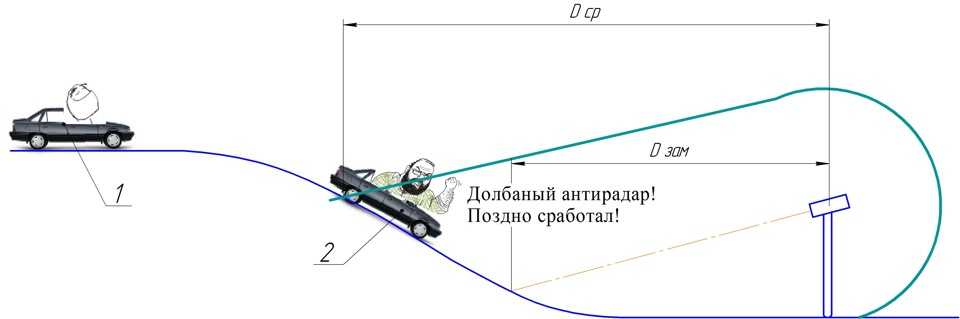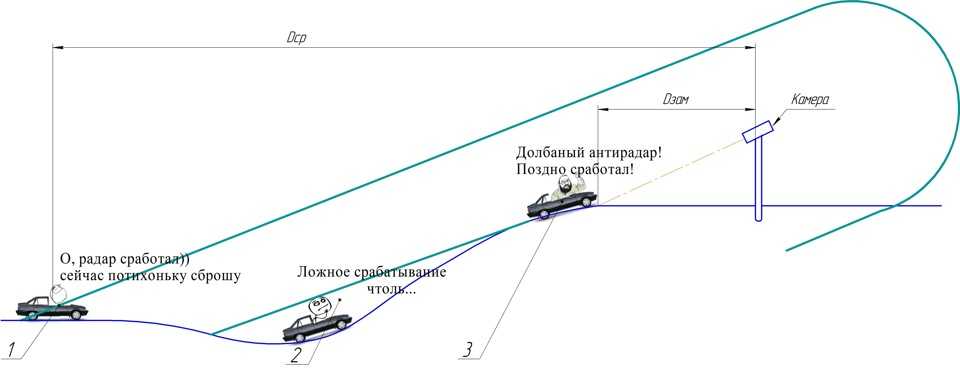 В данном случае радар-детектор поймал сигнал комплекса фиксации на достаточно большом расстоянии, однако после этого автомобиль попал в «мертвую зону» и оповещение временно отключилось. После выезда из ложбины транспортное средство оказалось сразу в точке замера скорости.