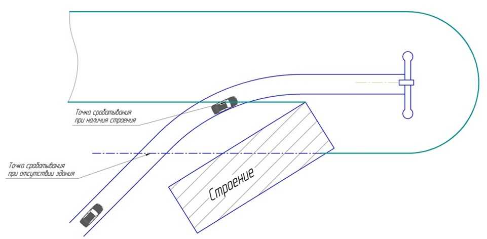 Похожая ситуация может сложиться в том случае, если комплекс фиксации нарушений расположен за поворотом и прямую видимость закрывает какой-нибудь объект или объекты (здания, деревья, горы и т.п.). По этой причине расстояние от точки срабатывания до точки замера минимальное.