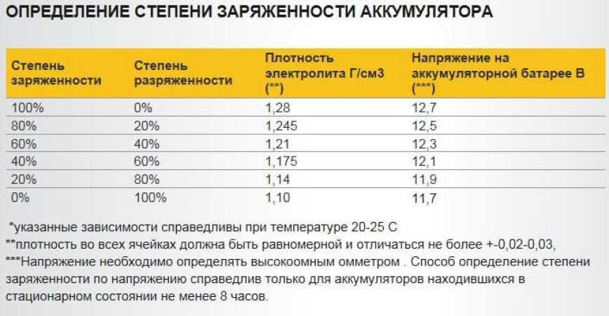 - 100 % заряду соответствует плотность электролита выше 1,27 г/см³