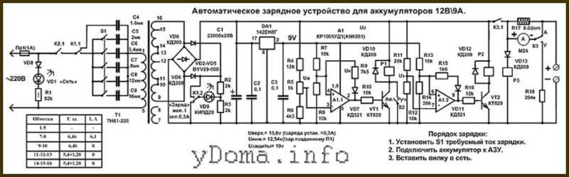 В схеме автоматики ЗУ применяют для питания операционного усилителя микросхему на 9 В типа 142ЕН8Г (DA 1). На каждые 10 градусов изменения температуры ее корпуса, выходное напряжение отвечает ростом на сотые доли вольта.