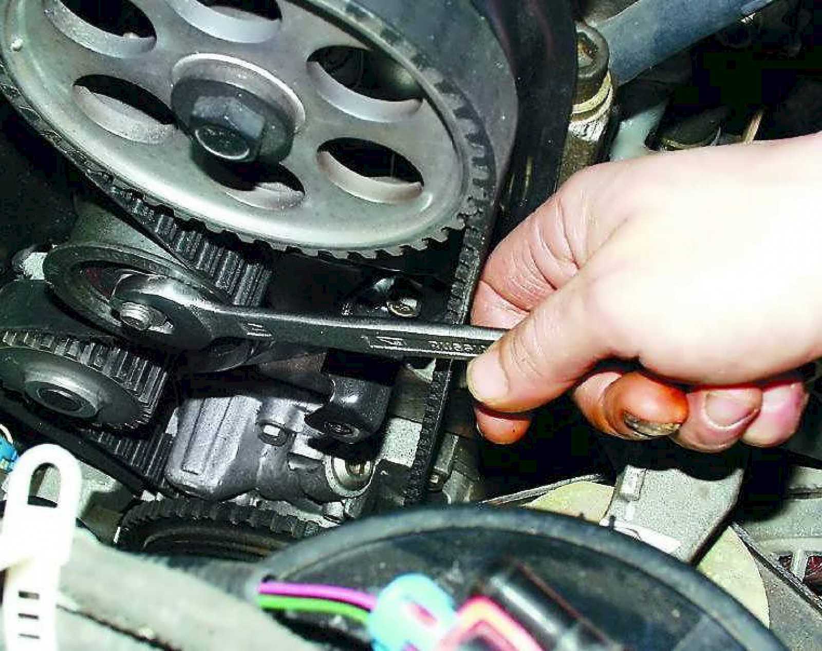 Поворачивая гайку на натяжном ролике, ослабляют ремень ГРМ, пока он не снимется.
