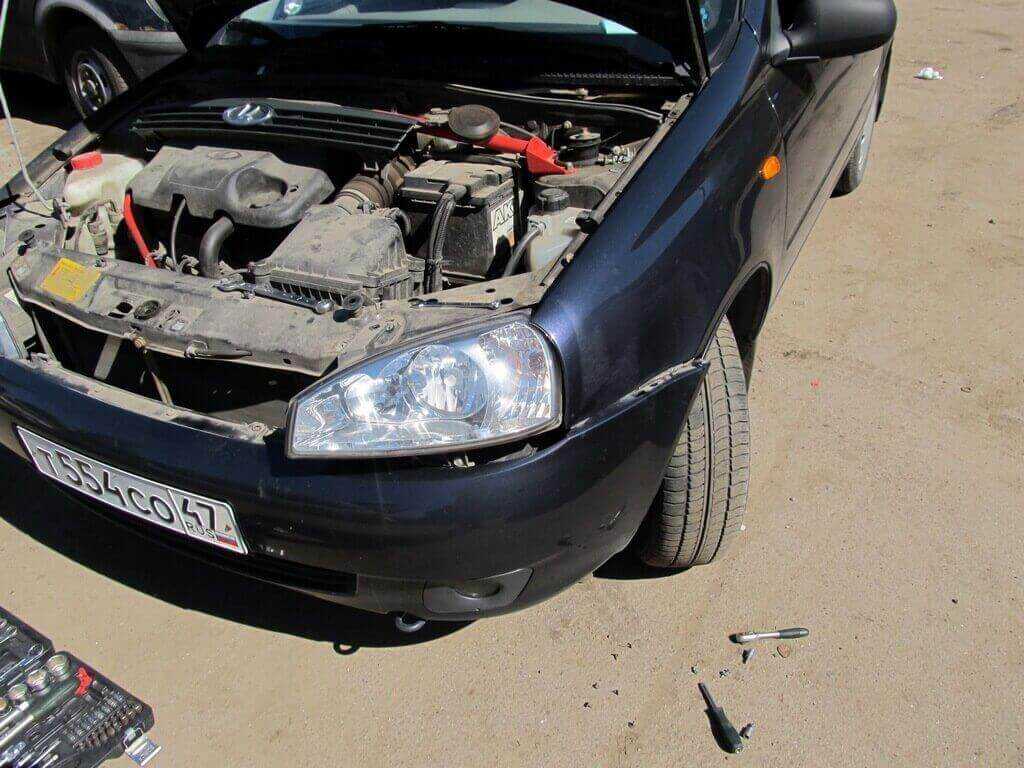 Для удобства работы нужно заранее помыть Калину и убрать пространство в гараже. Чтобы заменить фары, требуется демонтировать бампер и открутить несколько крепежных болтов.