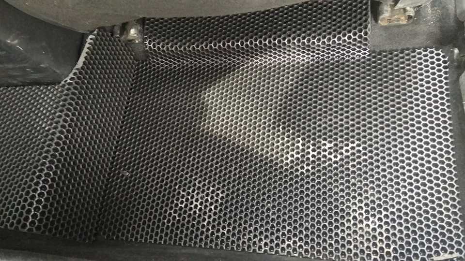 Самый большой плюс таких ковриков заключается в том, что они собирают в себе грязь и жидкости и легко чистятся от них. В резиновых ковриках грязь катается по всему полу, пачкает интерьер машины, и все это выглядит не очень, особенно зимой. Ворсовые коврики впитывают грязь так, что их потом бывает сложно отстирать, а жидкость вообще могут пропустить в пол автомобиля, что недопустимо. В ЭВА-ковриках грязь проваливается во множество углублений или сот и остается там. То есть грязь становится визуально менее заметной. Чтобы избавиться от накопившейся грязи, нужно вытащить коврик и отряхнуть его. Когда вытаскиваешь обычный коврик, то часть грязи и жидкостей можно пролить на пол автомобиля, а коврики ЭВА как будто запирают грязь внутри своих сот. Вот так выглядит коврик на входе в ателье: