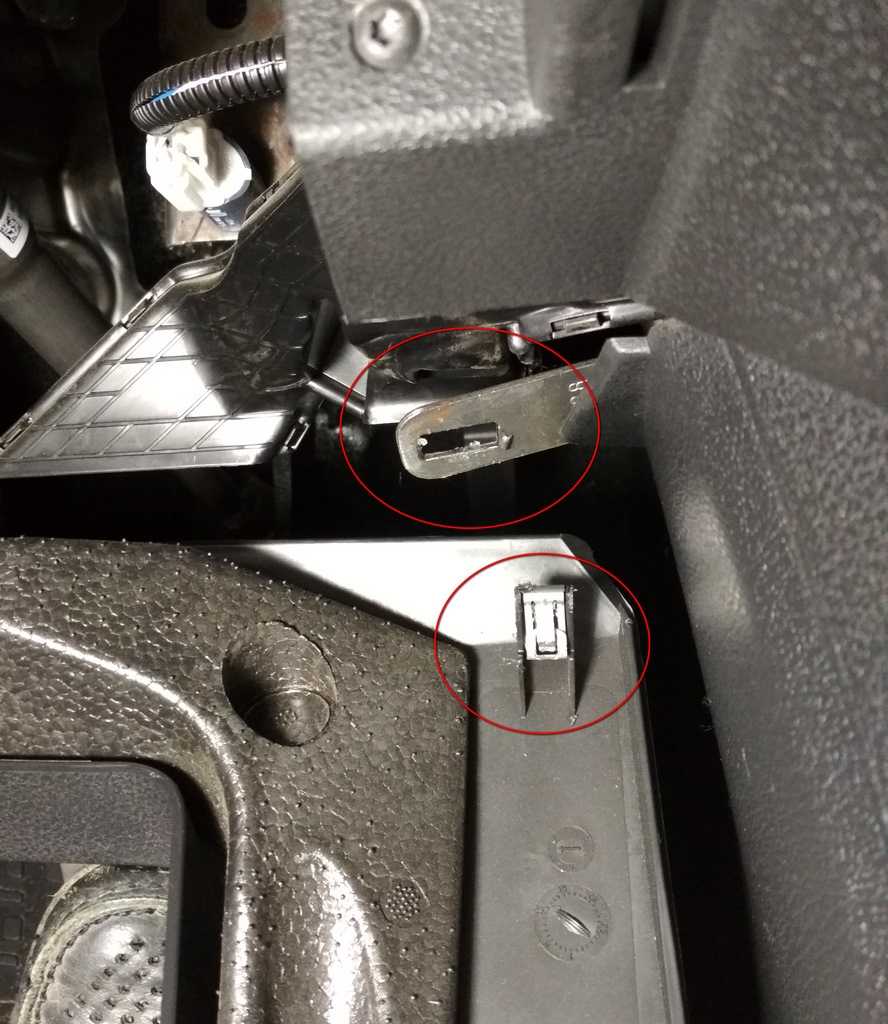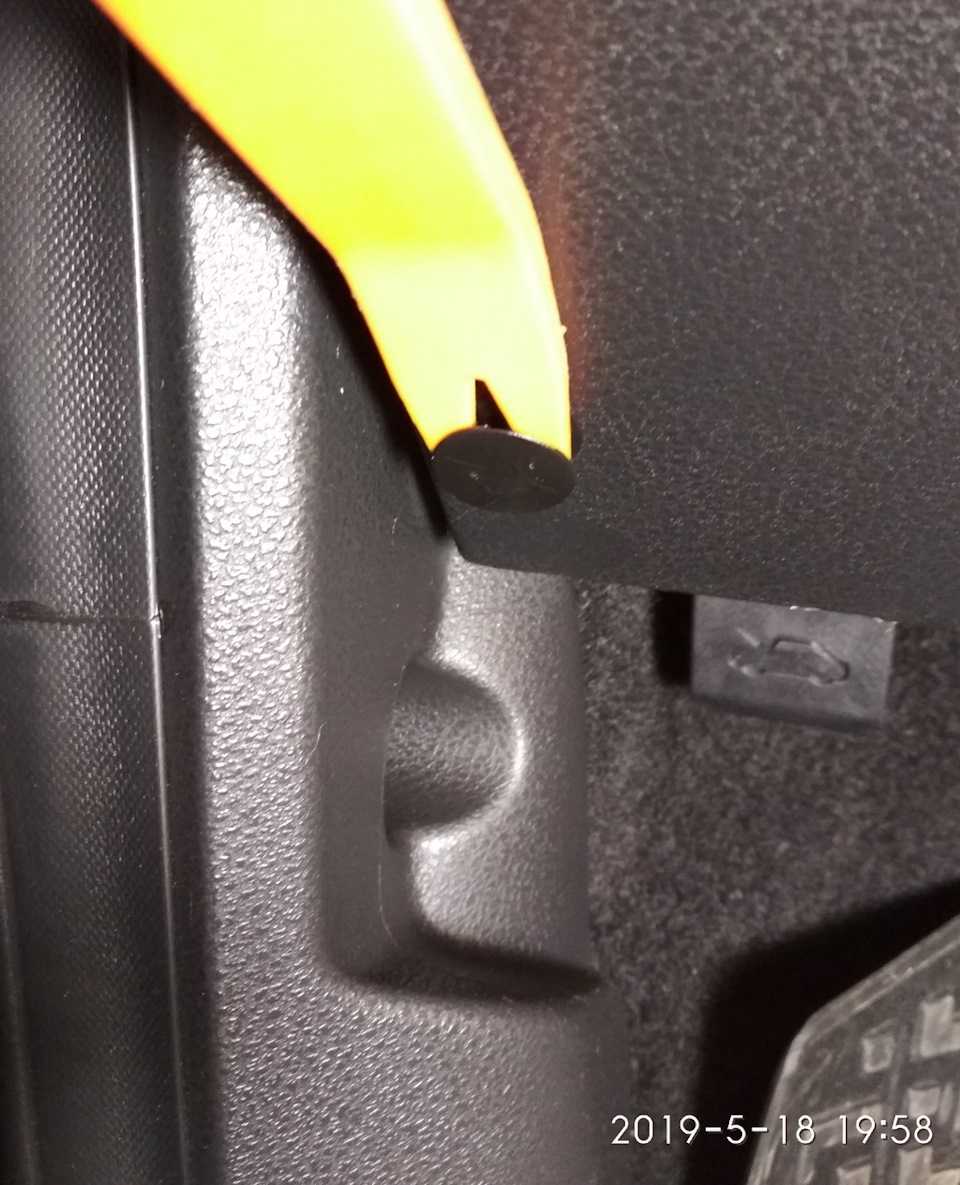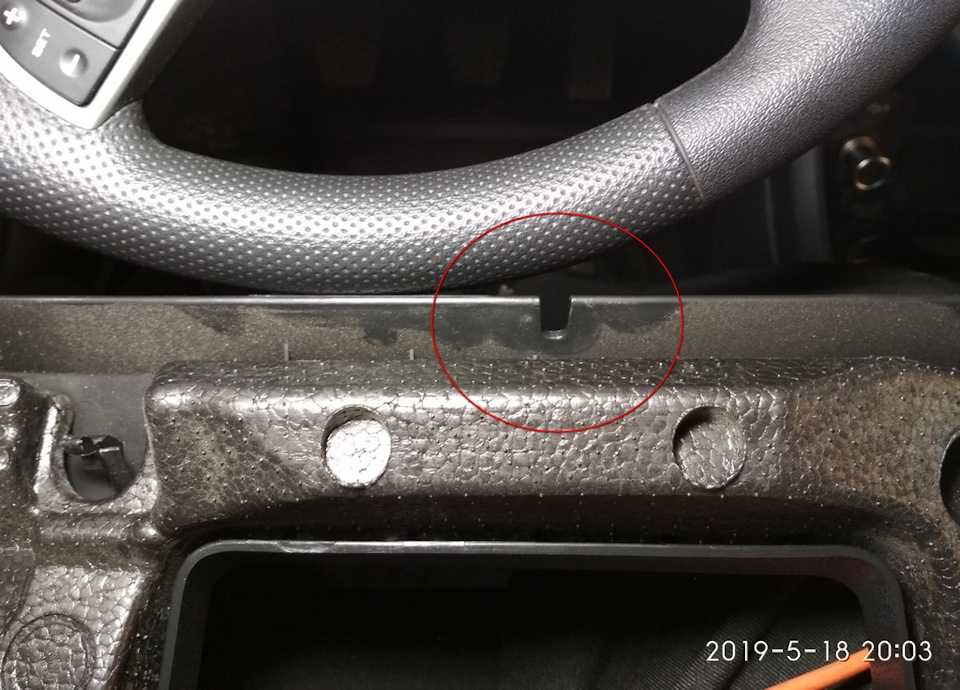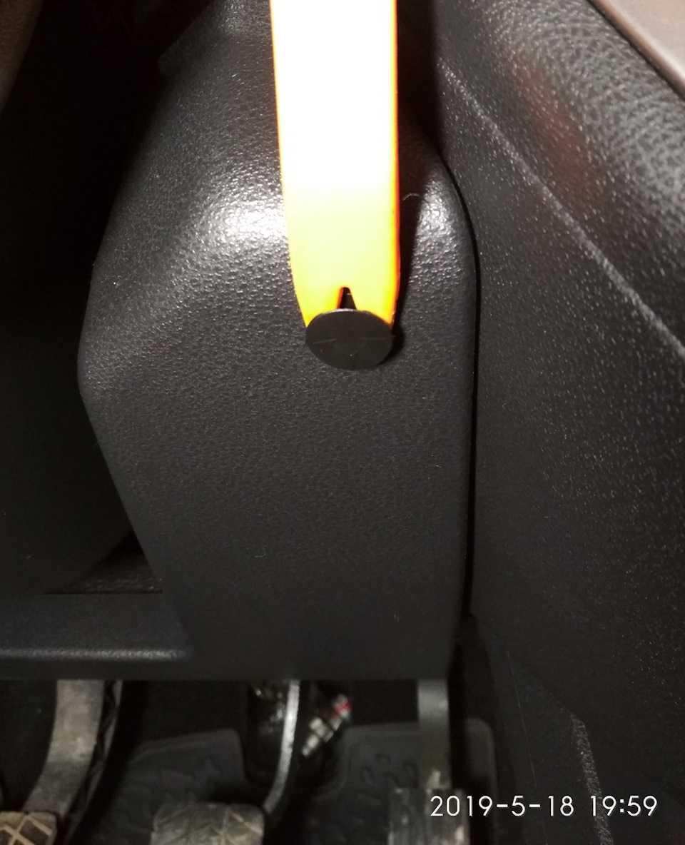 - Сядьте на водительское сиденье. Над левой и правой коленками увидите две заглушки – это клипсы, которые крепят нижнюю крышку рулевой колонки.