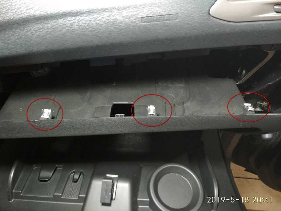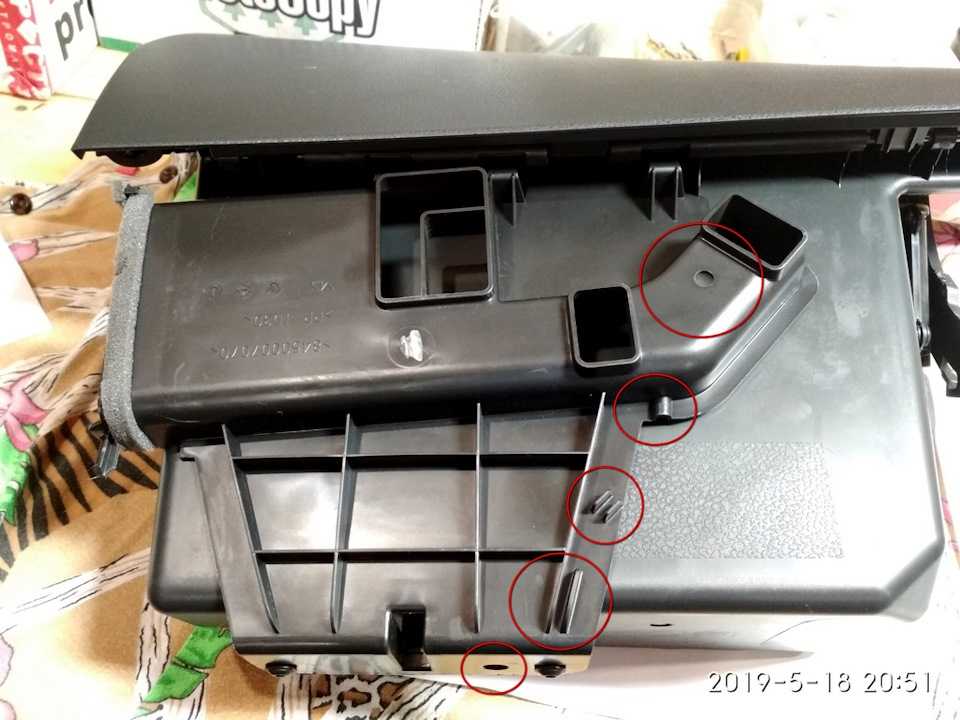 Уберите перчаточную емкость. Для этого откройте его и отожмите фиксаторы, которые удерживают крышку.