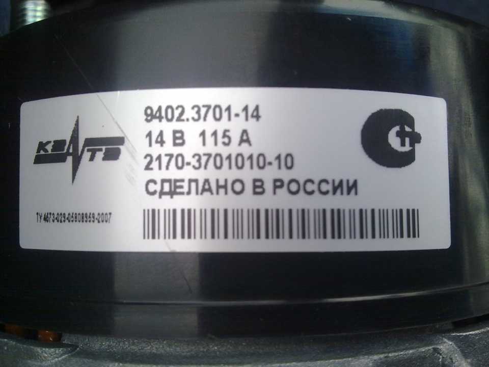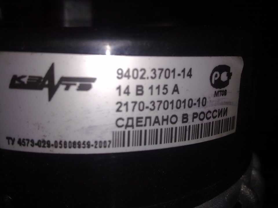 Генератор заводской номер: 9402.3701-14 (также 2170-3701010-10, 21700370101010)