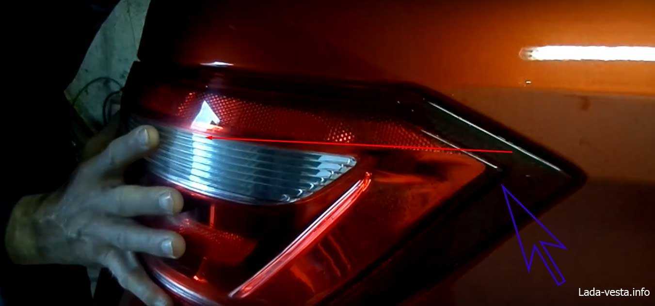 На фотографии выше синей стрелкой указано примерное расположение бокового фиксатора, для того чтобы полностью демонтировать фонарь аккуратно выталкивайте его при помощи одной руки со стороны багажника, тем временем другой рукой придерживайте фонарь снаружи, тем самым оберегая его от падения. После снятия задних фонарей можно приступать к демонтажу заднего бампера: