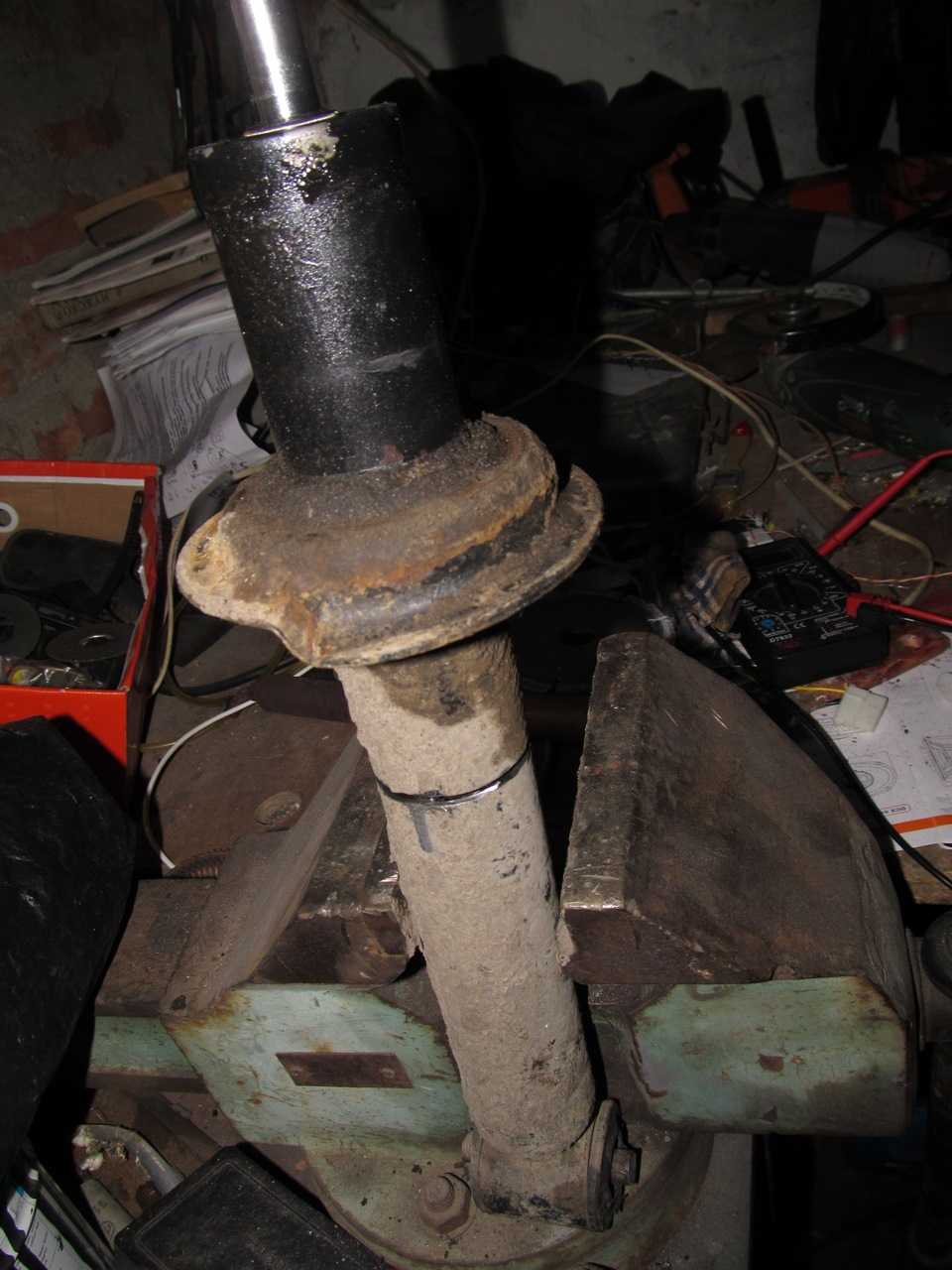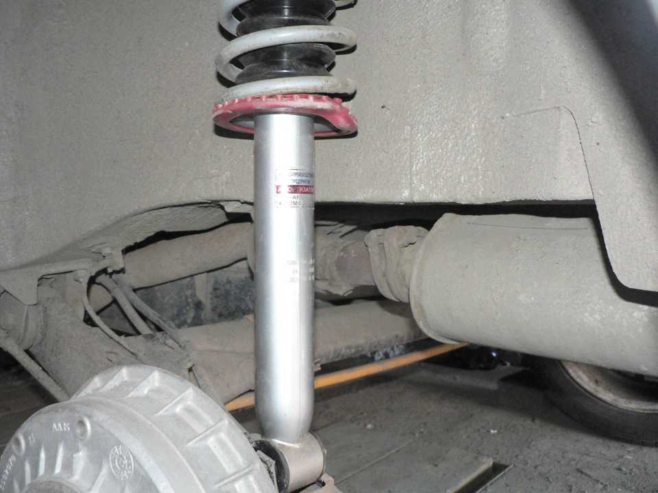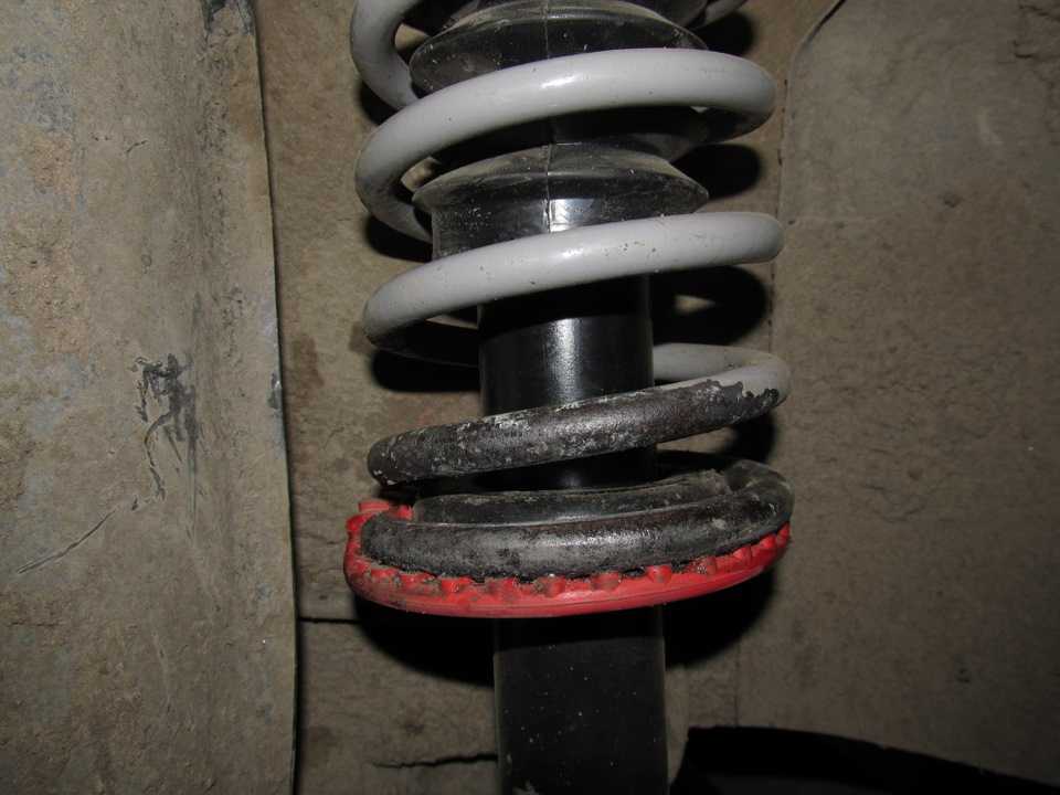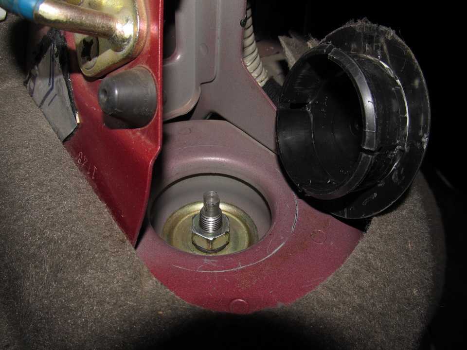 Устанавливаем амортизатор на место, при этом вытащив шток на всю длину. Ставим таким образом чтоб нижний конец пружины смотрел на колесо (для чего это делать так я не понял, может кто и подскажет). Устанавливаем болт с гайкой, но не затягиваем до конца. Я до этого болт смазал литолом, чтоб через несколько лет можно было его вытащить без проблем.Опускаем постепенно автомобиль, и смотрим чтоб шток попал в отверстие стакана кузова. Тут желательно иметь помощника: один следит за штоком, второй корректирует амортизатор и опускает автомобиль. Попадание штока в отверстие думаю это самый сложный этап установки данного агрегата, в этот момент и поймете как же хорошо иметь при себе натянутую резиновую трубочку (шланчик).Как только шток попал в дырку, устанавливаем верхний бублик, шайбу и закручиваем гайку на шток. Шайба имеет сферическую поверхность. Какой поверхностью устанавливать вверх (выпуклостью или вогнутостью я не знаю). На этот вопрос у нас возник спор. Установил выпуклостью вверх, хотя я думаю надо было наоборот.Вот установленная стойка.