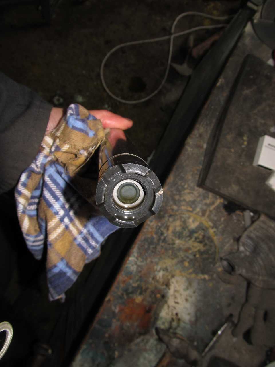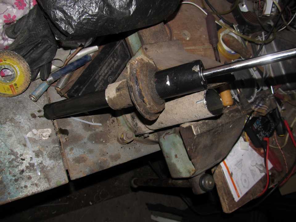 - Внутрь стойки наливаем достаточную порцию масла и устанавливаем вкладыш. Сверху закручиваем указанную гайку. Ее желательно накернить, чтобы предотвратить риск самопроизвольного откручивания. Если длина вкладыша окажется меньшей такового размера модернизированной стойки, то вытачиваем кольца потребной толщины, которые погружаем в стойку после установки вкладыша.