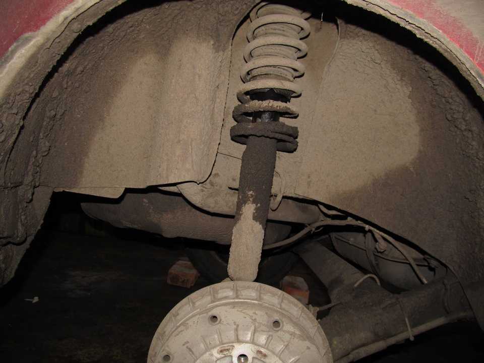 Собираем стойку и устанавливаем на свое законное место. Пружину оставляем старую, только ее хорошенько отмоем, чтоб понять ее состояние. Оказывается, что цвет ее — серый, а не грязе-защитный…