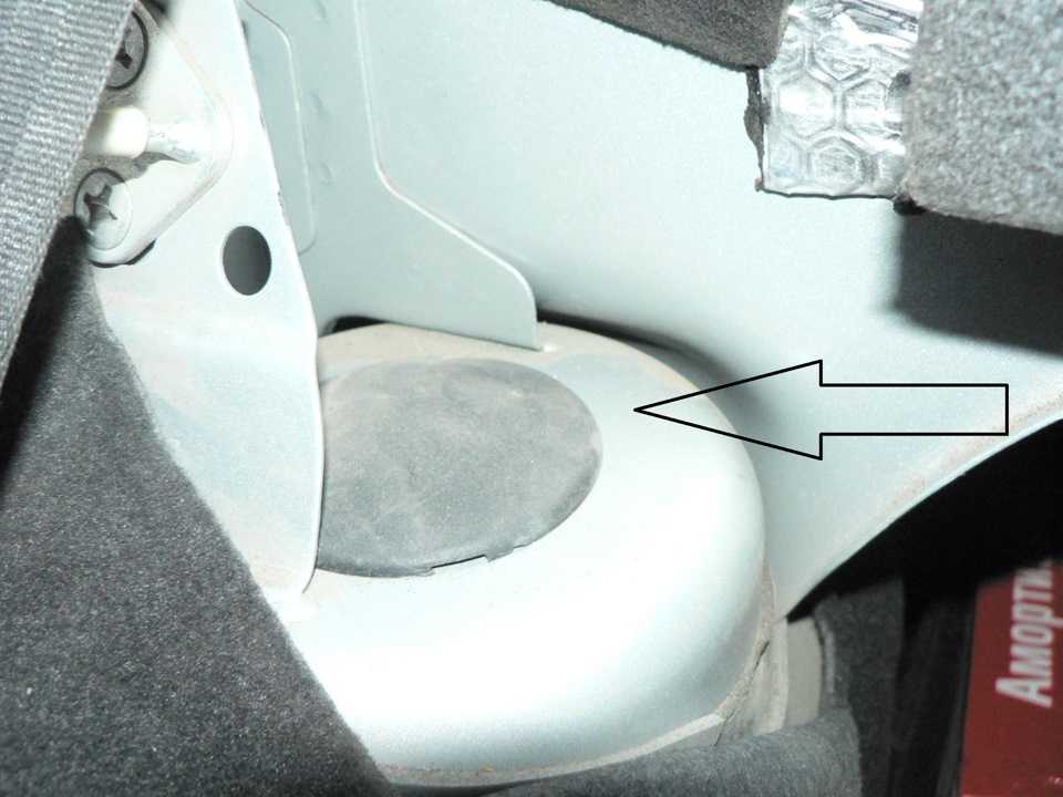 Часто, даже после того, как вы сняли стойку с автомобиля, буферная резиновая подушка остается держаться внутри чашки кузова брызговика задней стойки. В этом случае, дотянитесь до нее рукой и вытащите ее.