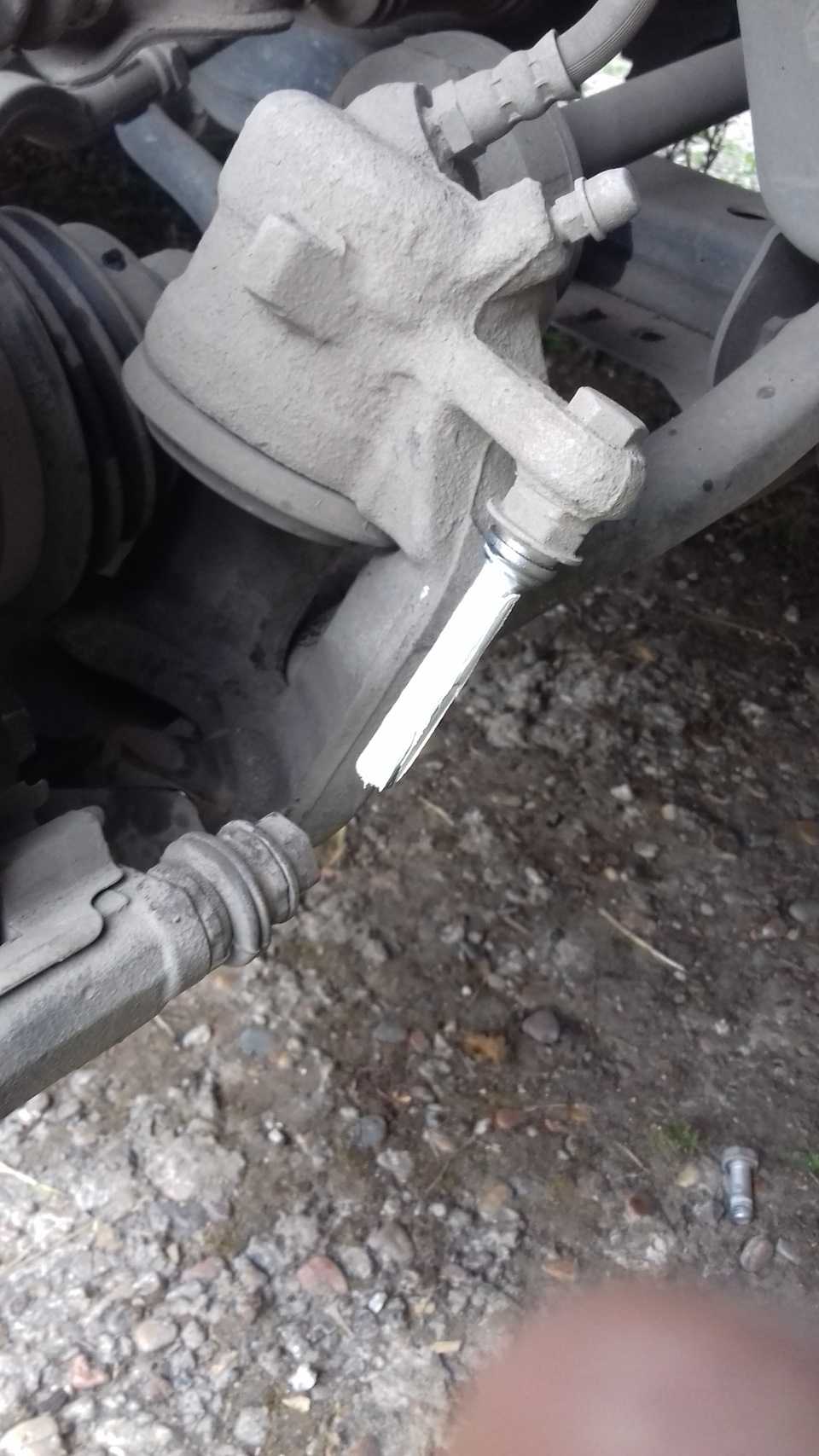 Аккуратно вынимаем верхнюю часть суппорта, и чтобы не повредить тормозной шланг, подвешиваем за стойку.