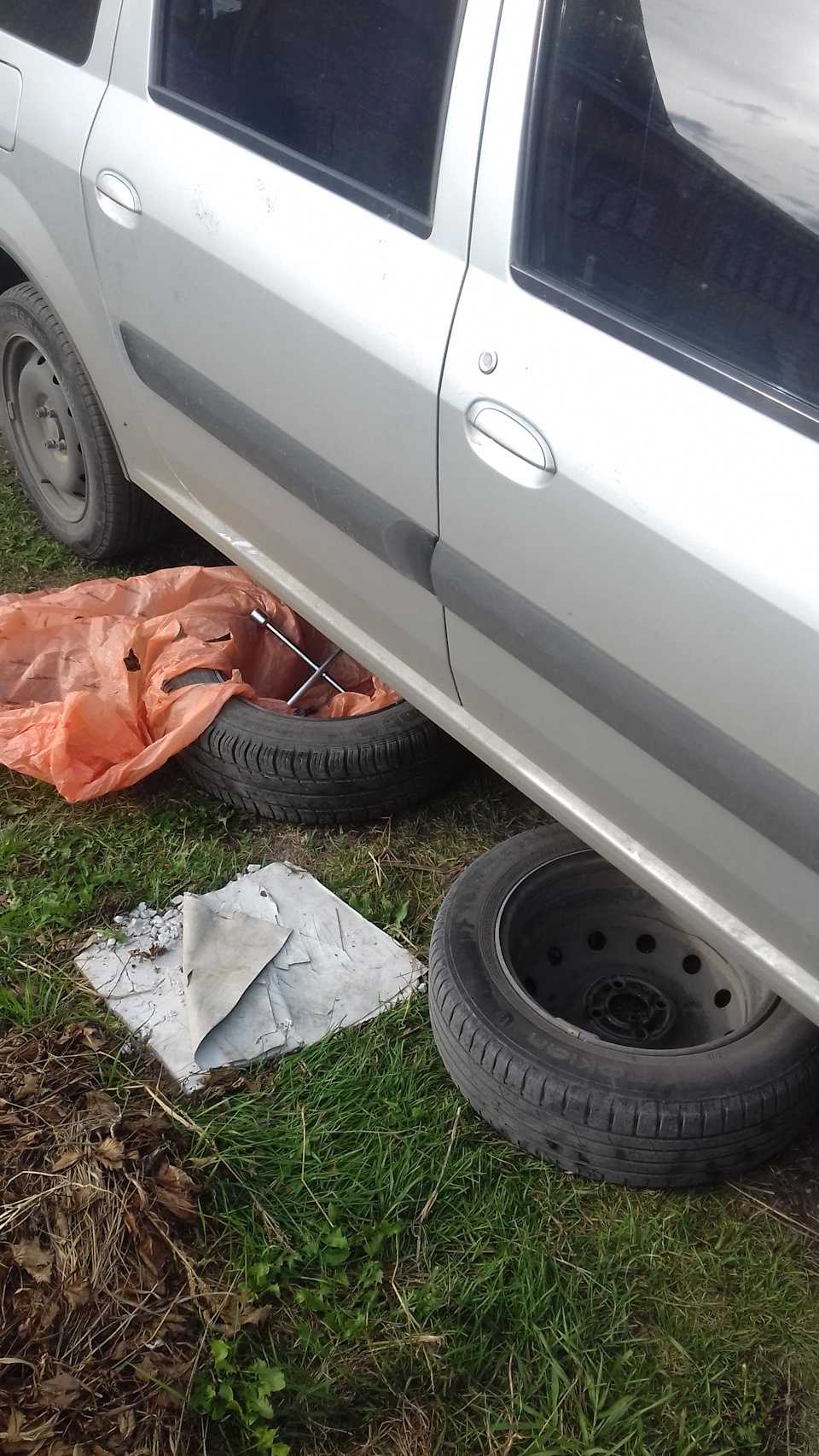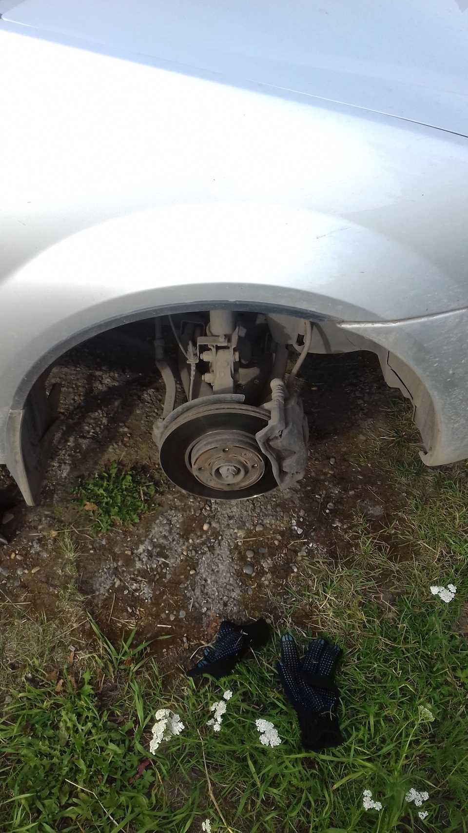 Балонным ключом срываем колесные болты и домкратим автомобиль. После этого полностью откручиваем колесо и убираем его под порог поднятой стороны для дополнительной страховки.