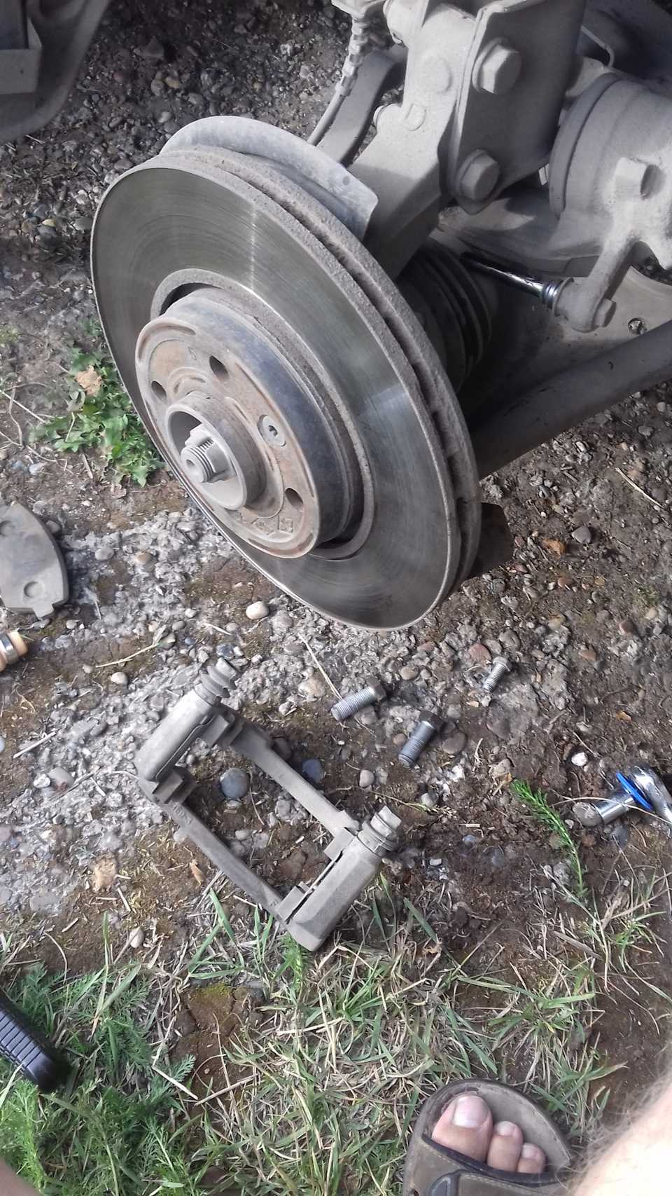 Теперь нам нужно снять суппорт от ступицы. Но прежде чем делать это лучше всего все болтовые соединения залить смазкой WD-40 или любым другим подобным средством для откручивания приржавевших деталей. Болтовые соединения тормозной системы часто прикипают и чтобы не сорвать резьбу, лучше перестраховаться.