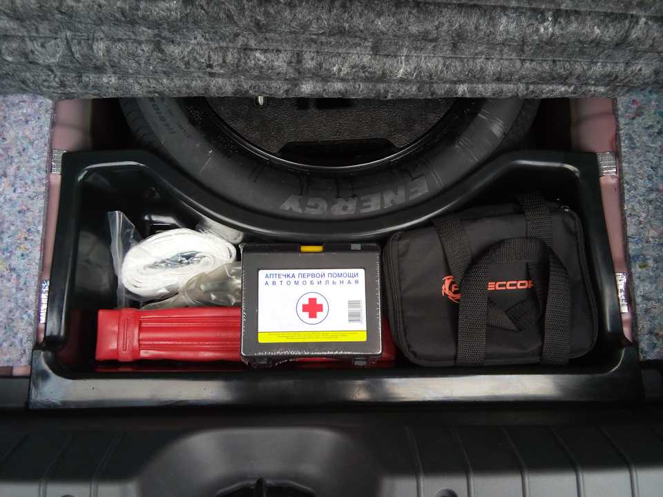 Запаска чудесным образом располагается под ковриком, в отдельном боксе. Сюда же вмещается органайзер для инструментов, устанавливающийся в пространстве диска, рядом поместятся подколесные упоры. Около колеса можно хранить и другие полезности, необходимые для обслуживания самой машины, например, небольшой домкрат. Таким образом, набивая багажник под завязку, владельцу авто не придется оставлять запаску дома или пристраивать ее в салоне.