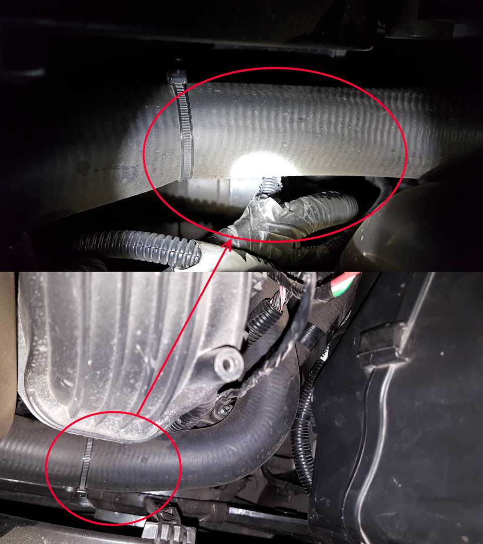 Передний патрубок системы охлаждения соприкасается со жгутом проводки мотора. Парубок трется о гофру, что может печально закончиться. Причем простая обмотка изолентой помогает ненадолго, а потому это не выход.