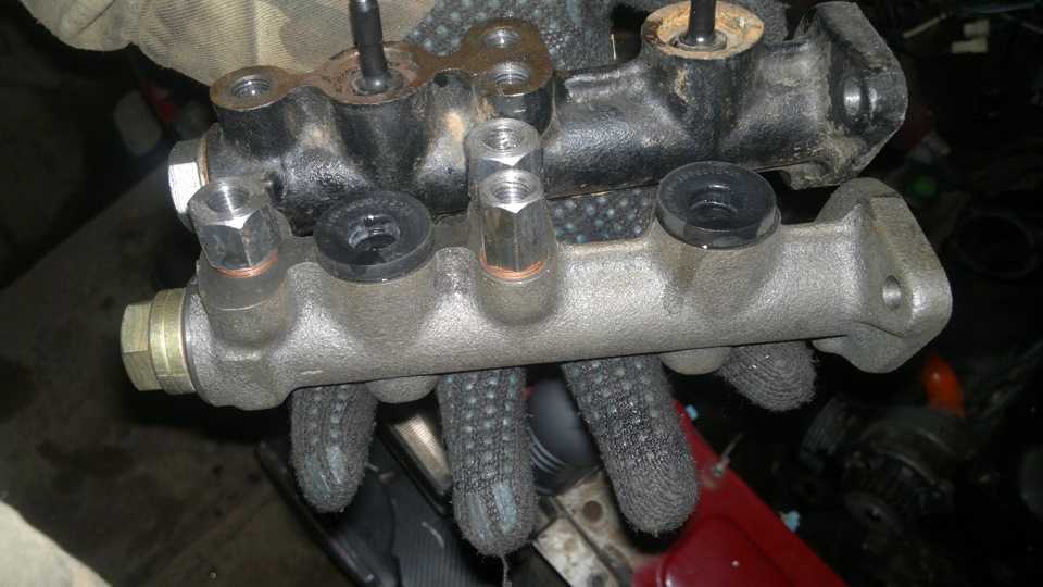 Глухой торец корпуса закрыт резьбовой пробкой, с другой стороны расположен фланец крепления к вакуумному усилителю. Шток от педали тормоза прикреплен к первому поршню. К нижним отверстиям присоединены трубки тормозных контуров – отдельно для передних и задних колес.