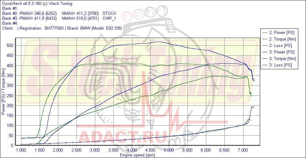 Синяя линия — прошивка АДАКТ, зеленая — стоковая программа. На верхнем графике — крутящий момент (+26%), на среднем — мощность (+19%)