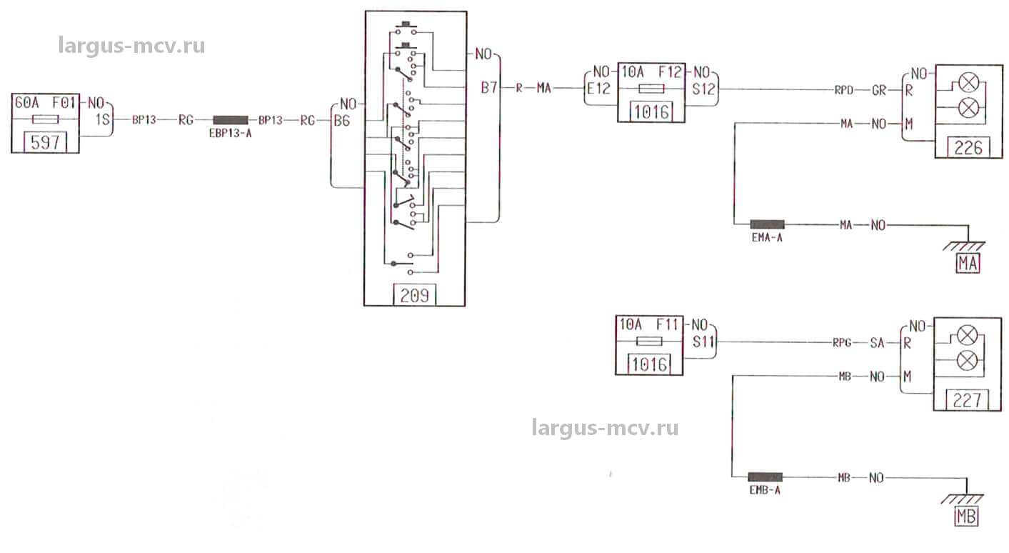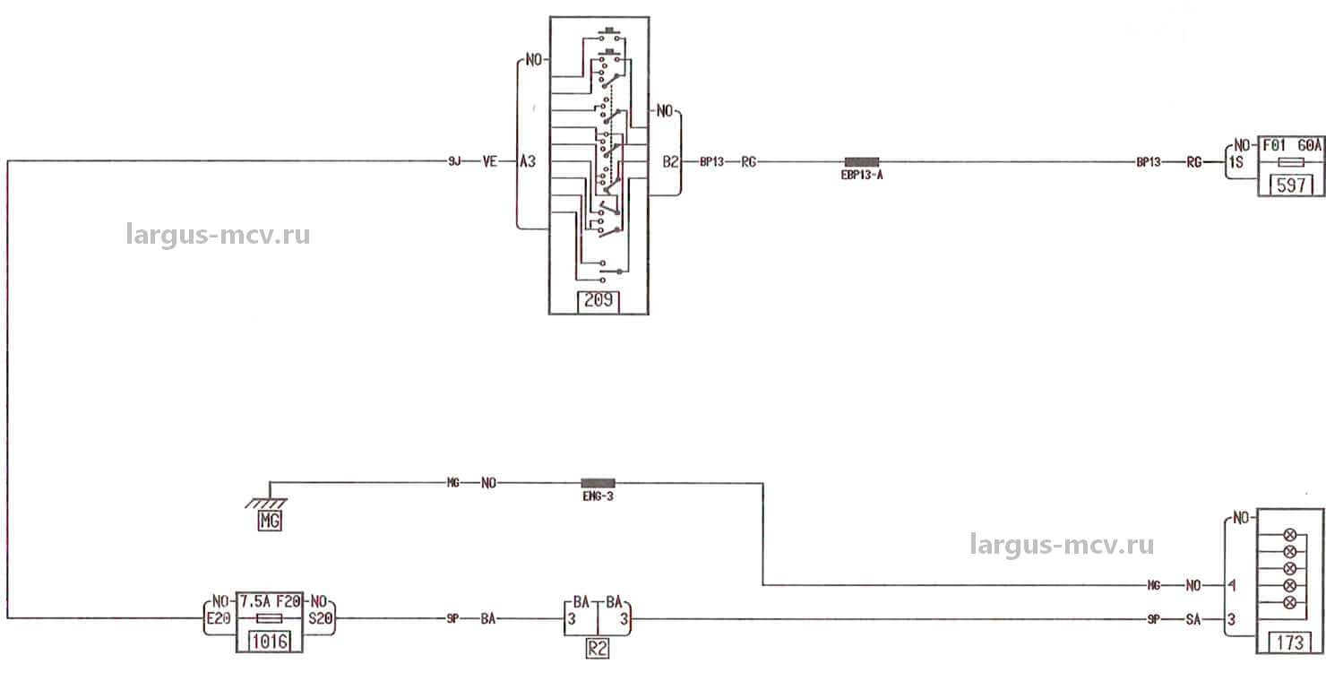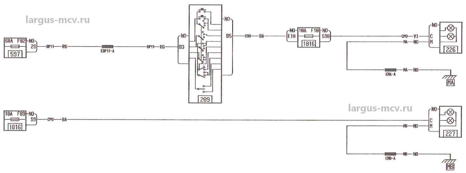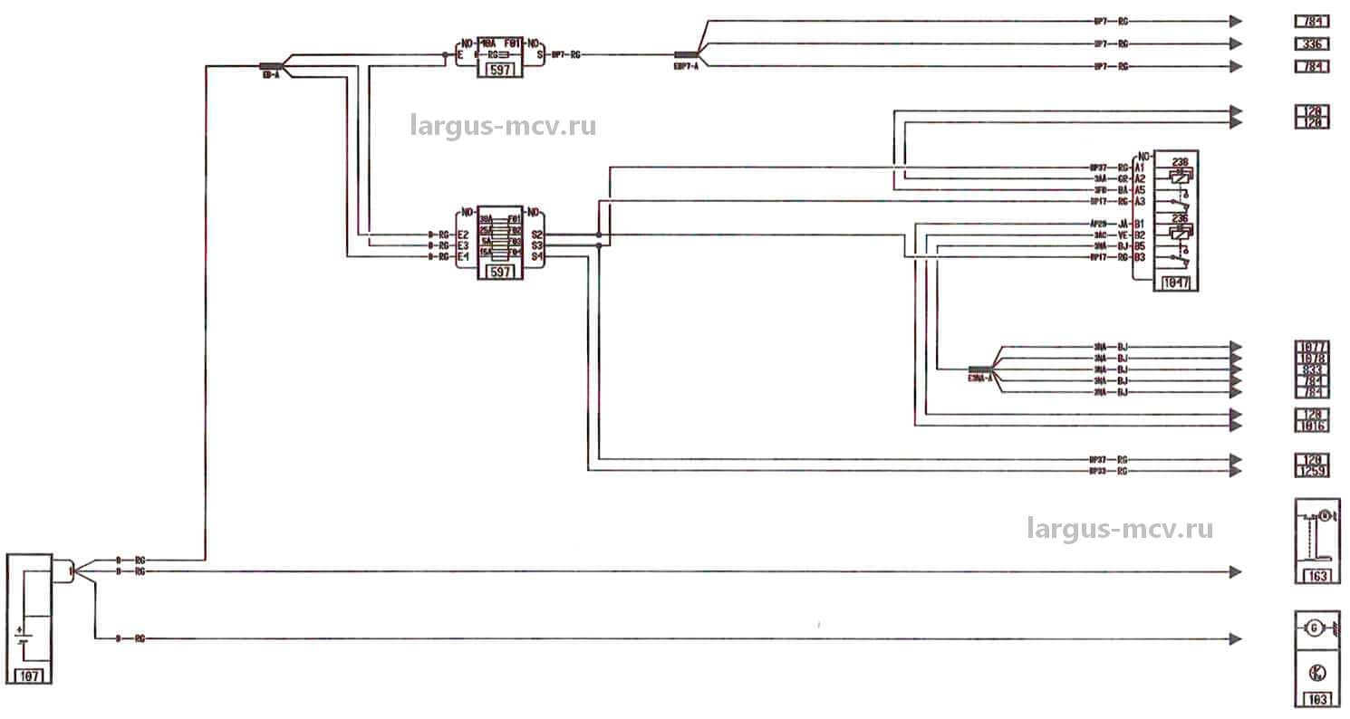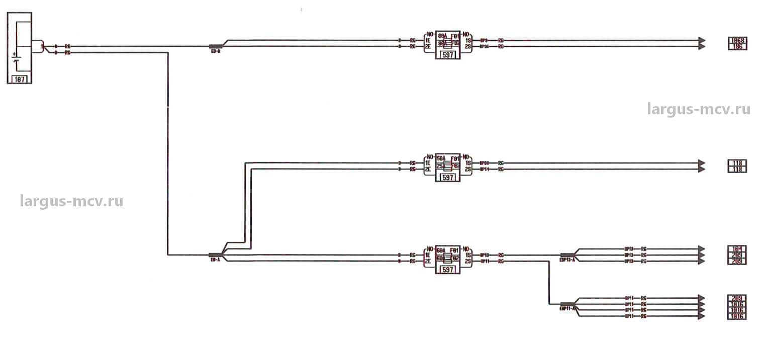 | 597-3 | F1 (50 A). F2 (25 А) | Переключатель наружного освещения, блок предохранителей в салоне |