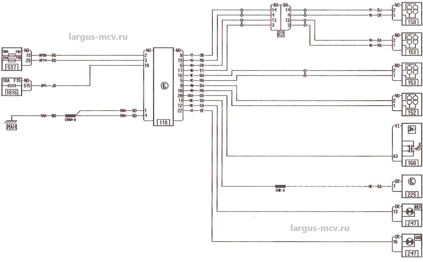 | 597-1 | F1 (60 A), F2 (60 А) | Электронный блок управления системами ABS и ESP |