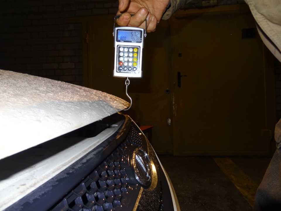 Геометрическими измерениями заниматься не хотелось. Решил проверить практическим способом — померить силу на закрытие капота с установленными упорами и без них.
