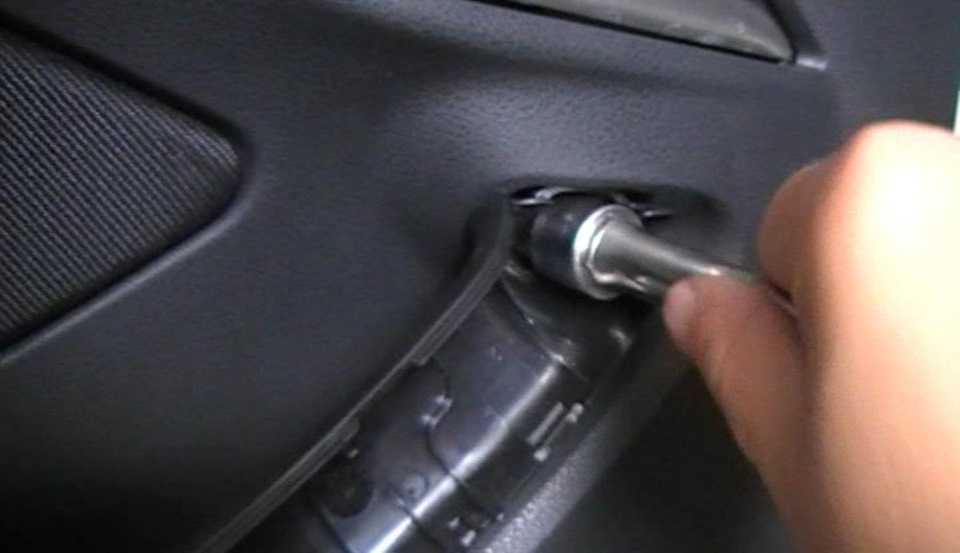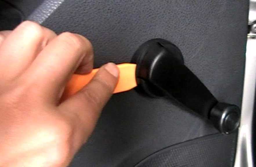 Сперва требуется снять ручку стеклоподъемника. Для этого нужна пластиковая лопатка из специального набора для разборки дверей. Впрочем, если ее нет, можно воспользоваться тонкой отверткой иди ножом, но предварительно инструмент необходимо обмотать тканью, чтобы не повредить пластик.
