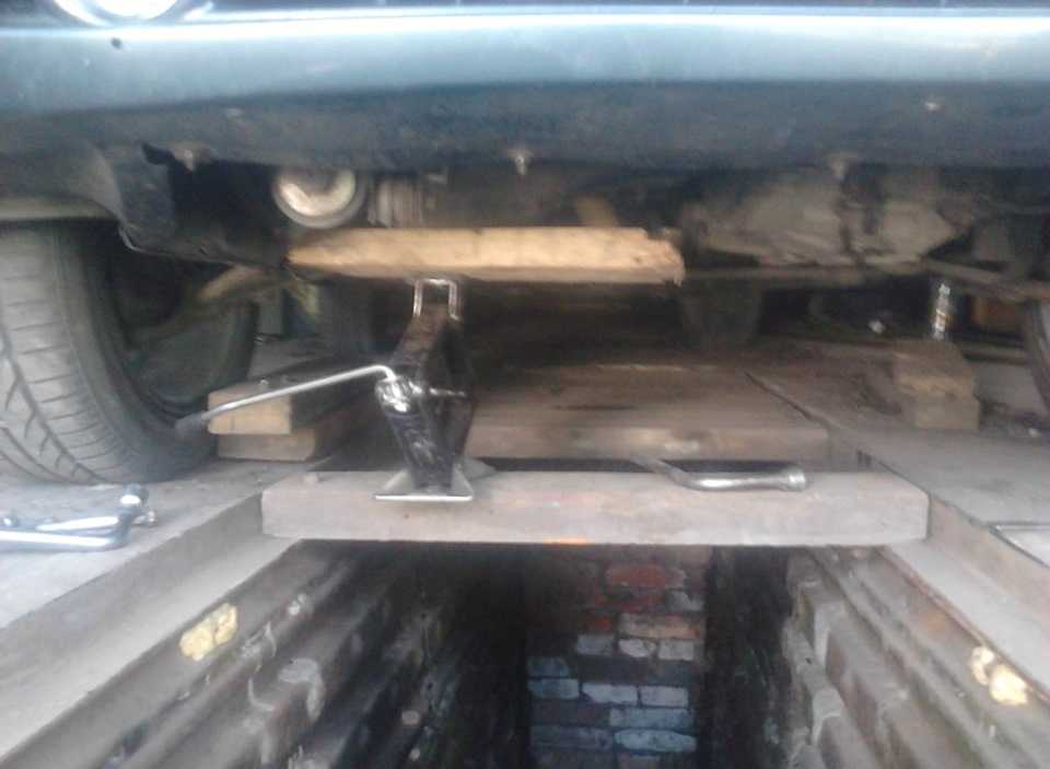 Замена левой опоры производиться точно так же как и правой, только домкрат необходимо устанавливать под КПП. Упор необходимо производить через деревянную подкладку.