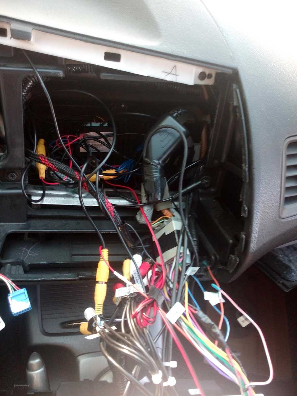 Тут возможны варианты, так как кабель можно провести по полу или над дверьми. В первом случае его можно провести мимо панели приборов, во втором случае через правую переднюю стойку. В итоге провода должны доходить до тыльной стороны мультимедийной системы. Но перед подключением, вам надо будет демонтировать облицовку, а затем и саму ММС, чтобы максимально облегчить подключение кабеля.