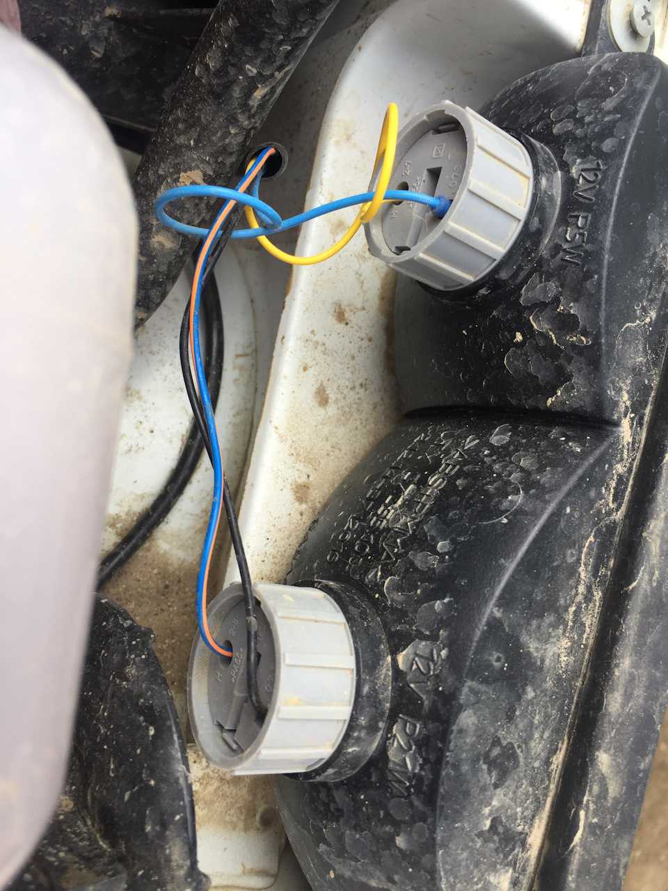 4. Просверлил в чашке фары 2 отверстия диаметром 3,5мм, что бы провести провода.5. Вывел провода через заглушку где идут гидрокорректоры, зафиксировал стяжными хомутами.6. В фаре есть фишка, ее подцепляем к стандартной фишке. Есть 2 провода, желтый и красный.Желтый провод фары соединяем с желтым проводом надфарника.Красный провод фары соединяем с сине-оранжевым проводом надфарника.