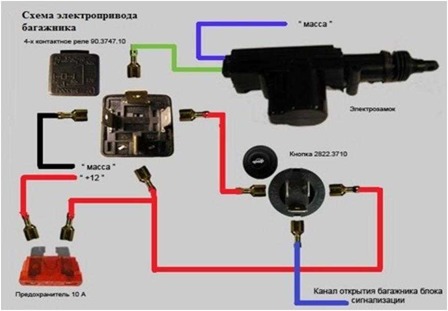 Для подключения потребуется набор инструментов для пайки (припой, паяльная лампа, изолента или термоусадочные трубки), а также дополнительные детали. В схеме обязательно должно присутствовать силовое реле с диодом. Именно оно дает кратковременный электрический импульс, который открывает дверь багажника.