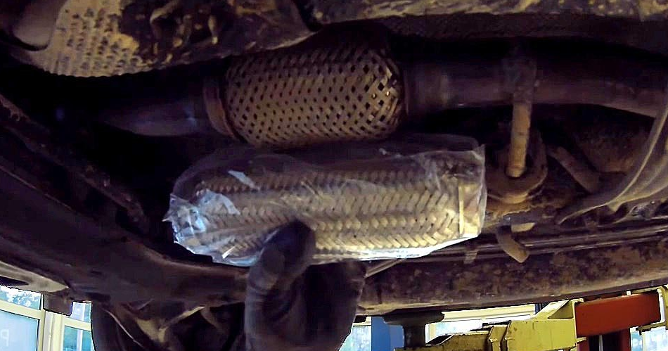 Необходимо спереди и за глушителем поставить хомуты и зафиксировать их. А после этого между ними натянуть пружины – по одной с каждой стороны. Эти пружины будут стягивать гофру.