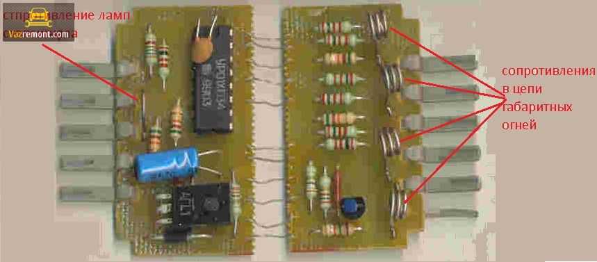 - Отпаять проволочные сопротивления, подлежащие замене (заменять нужно только те резисторы, лампы в цепи которых подверглись замене на светодиодные. Для передних габаритов это спиральки, расположенные между ножками 7-8 и 10-11 реле, для задних габаритов — спиральки между ножками 1-7 и 9-10).