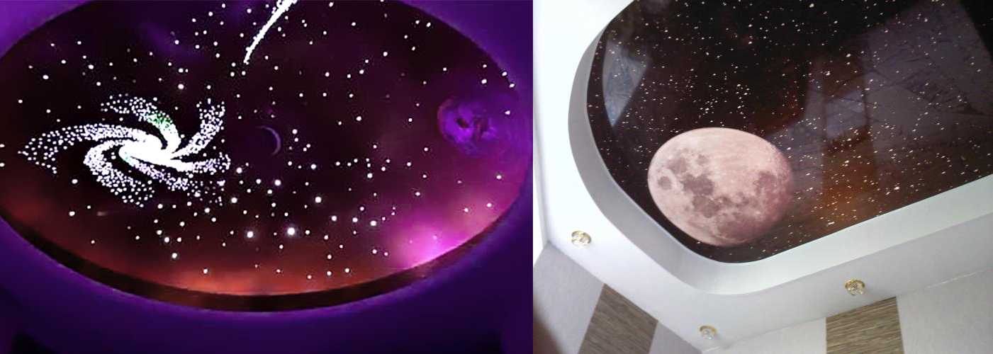 На сегодняшний день существует масса различных вариантов дизайна «звёздного» потолка: навесные конструкции с оптическими волокнами, светодиоды, широкоформатная печать, комбинация всевозможных отделочных материалов, а также новые приспособления техники и так далее.
