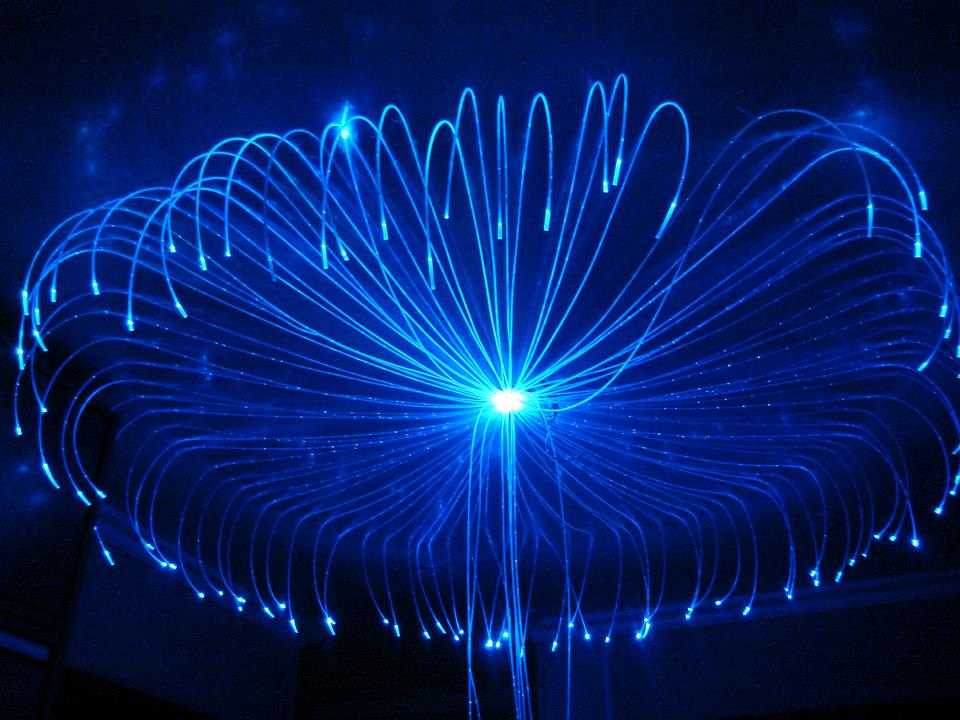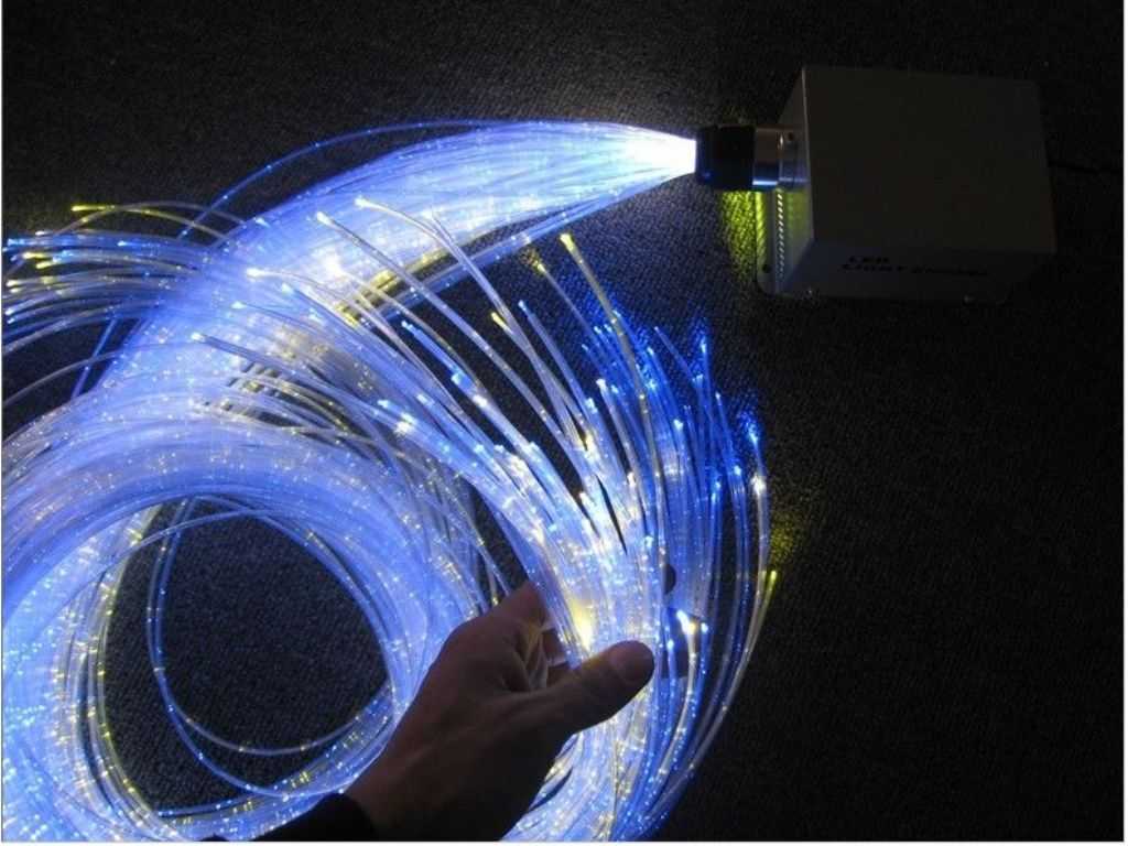 В соединительную головку можно установить вплоть до 765 нитей, толщиной 0,75 мм. Такие проекторы позволяют организовать равное свечение торцевых частей нитей оптоволокна, а также создать эффект мерцания (достигается за счет использования перфорированного фильтра).