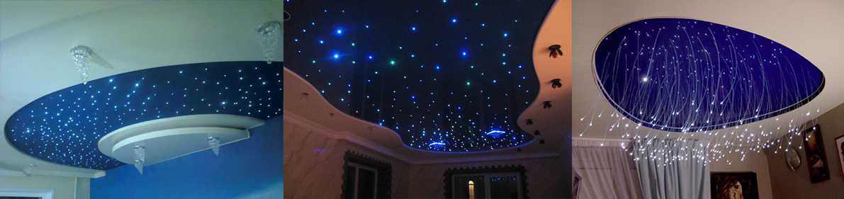 Первый вариант очень эффектный, но дорогой. Он состоит из оптиковолоконной системы и натяжного полотна (тканевого либо плёночного). Однако вторая вариация тоже впечатляет своей красотой.