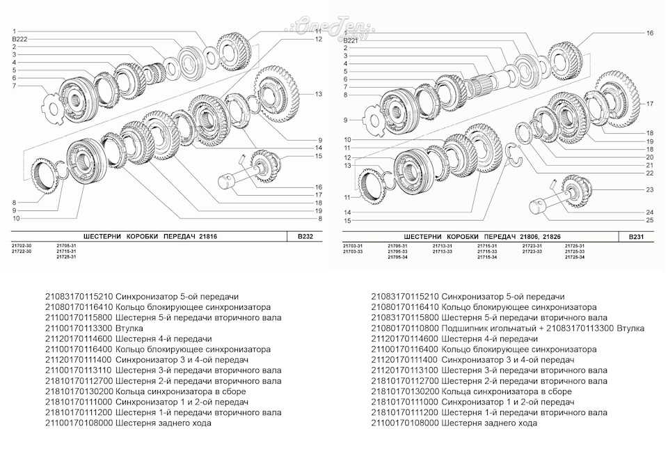 На 21810 и 21816 установлен первичный вал 21100-1701030-00 и вторичный вал 21100-1701105-00.У 21806 и 21826 установлен первичный вал 21100-1701030-00 и вторичный вал 21120-1701105-30. Такая разница в валах тянет за собой различия в пакете наборных элементов вала.Шестерни коробки передач.