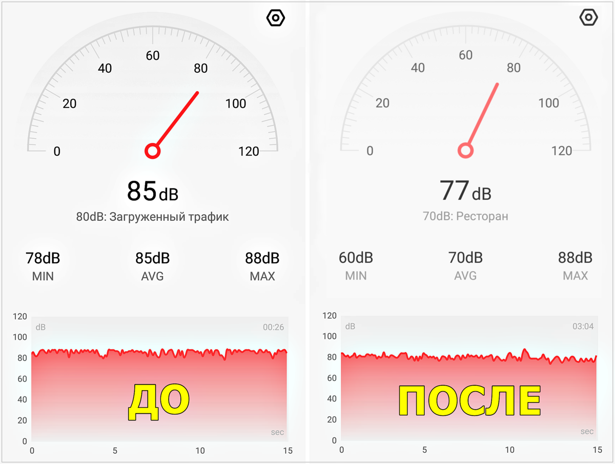 Итак… Сразу скажу, что «вау-эффекта» нет (помним про бюджет). Но, тем не менее, стало тише, что подтверждают измерения уровня шума «до» и «после». Уточню, что измерения проводились не с целью выяснить сколько там децибел в реальности, а сравнительно — приложение «Шумомер» в смартфоне на точный прибор уж никак не тянет. Но общее представление получить можно и результаты измерений показали наличие эффекта!