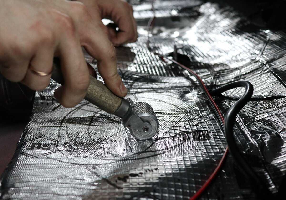 - Саму шумоизоляцию нужно делать в теплом помещении. Для начала необходимо наклеить слой виброизолирующего материала (нарезать ножницами листы необходимых размеров, нагреть битумную сторону феном, на подготовленное место кузова приложить нагретый кусок).