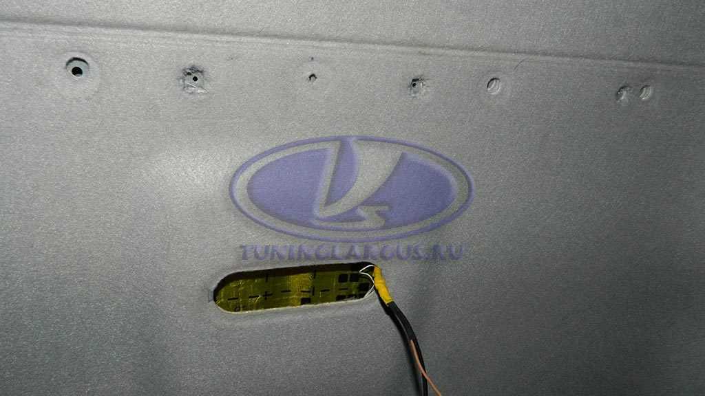 Во-вторых, нужно сделать вырезы в потолке под выступы в передней части полки, там, где она крепиться саморезами, как и под штатную полку, тогда она окончательно плотно садится. Это отверстия под штатную полку…