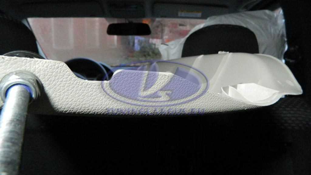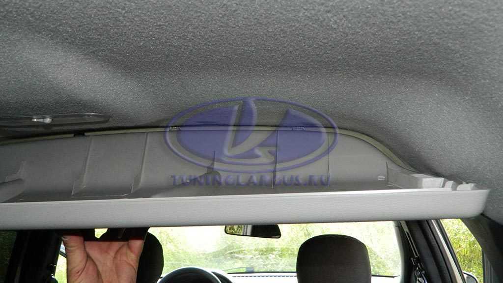 Но оказалось, что тогда переднюю часть полки невозможно закрепить, поперечная балка крыши там просто заканчивается (как раз на уровне стыка обивок потолка). Кроме того болты в кронштейнах были наклонены вниз и полка не встала бы горизонтально.