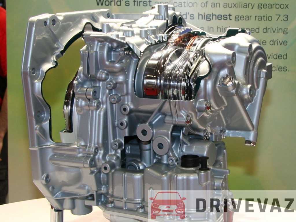 У агрегата Jatco JF011E, который ставили, к примеру, на Nissan X-Trail, гидротрансформатор передает вращение планетарному механизму, обеспечивающему возможность движения вперед и назад. Дальше крутящий момент приходит на пару раздвижных шкивов, соединенных гибким стальным ремнем. Это и есть устройство, меняющее передаточное отношение между ведущим и ведомым валами. От последнего приводится главная пара. Дальше только дифференциал, приводы и колеса. А у модели JF015E планетарный механизм обеспечивает не только задний ход, но и два передаточных отношения на переднем ходу.