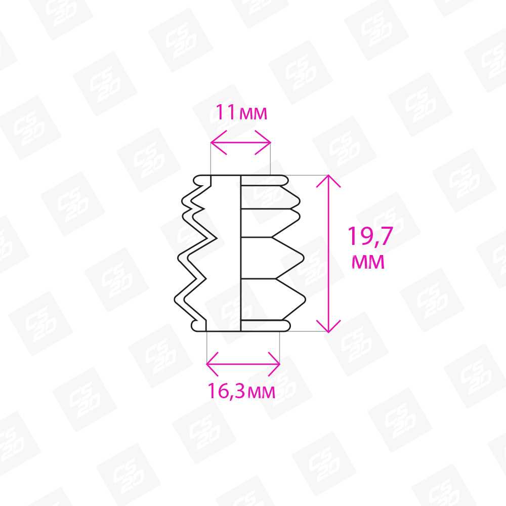 Размер пыльника должен соответствовать параметрам направляющего пальца. Не рекомендуется приобретать пыльники меньшего или большего размера, так как основной задачей пыльника является защита подвижного механизма и удержание достаточного количества смазки. Пыльники CS20 производятся с точным соблюдением заводских размеров и подходят для отечественных автомобилей следующих марок: