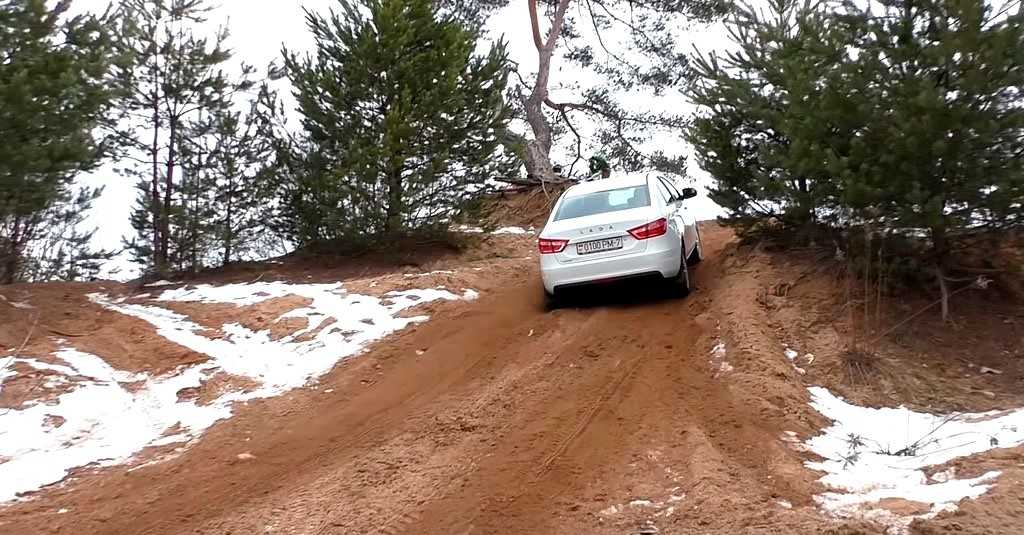 Седану было дано тяжёлое задание. Машина практически висела между краями канавы на двух колёсах. Обычно, такая ситуация требует обязательной помощи извне. Но электроника отлично справилась с заданием. Равномерно распределяя подачу топлива, она без труда позволила не только выровнять Весту. Седан, словно кроссовер с лёгкостью взобрался на противоположный скос канавы и также просто вернулся на главную дорогу.