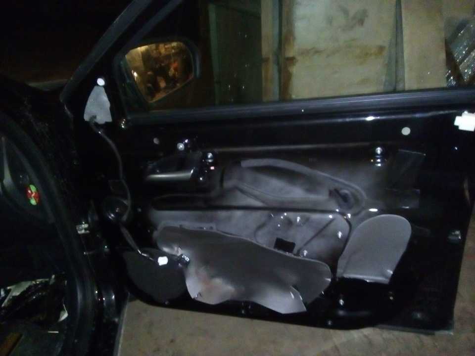 Снимаем обшивки дверей и удаляем шумоизоляцию с мест, где будут располагаться динамики. АвтоВАЗ решил позаимствовать решение у Renault Logan. Место, куда должны ставиться динамики имеет три отверстия для крепления, а не четыре.