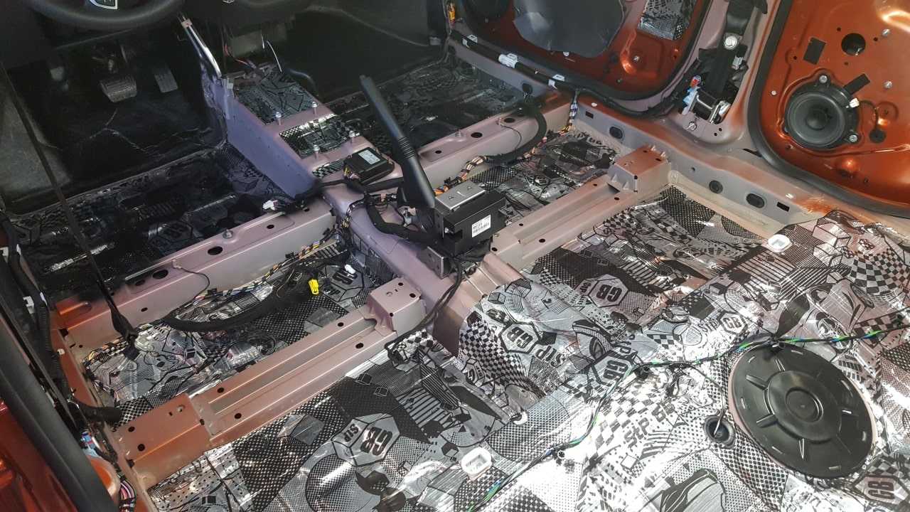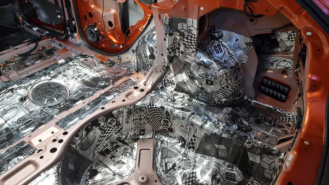 При монтаже шумопоглощаеющего слоя мы используем материал Барьер. Это кропотливая работа, которая требует аккуратной раскройки и подгонки материала , а также 100% прилегания к вибродемпфирующему слою.