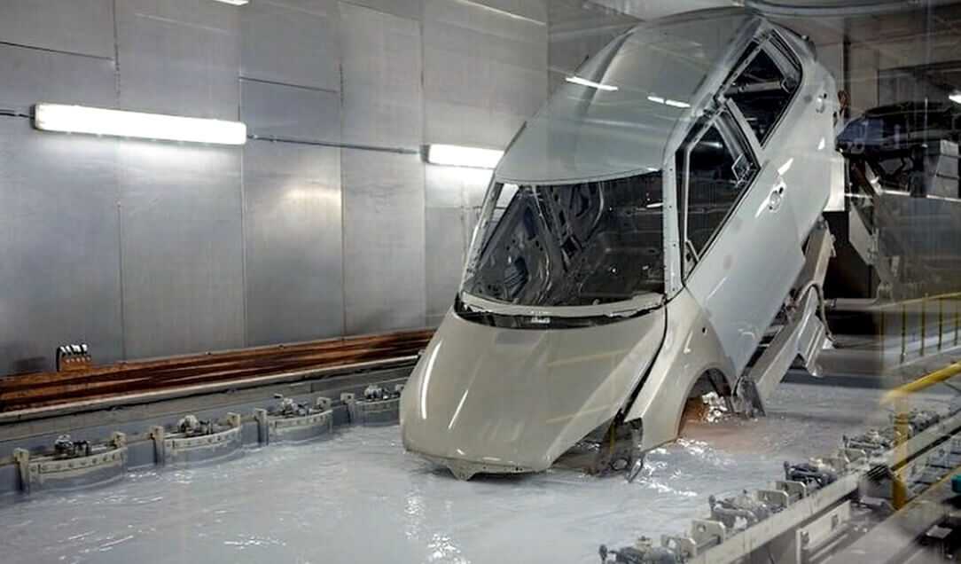 На заводе в ванну наливают расплавленный цинк, разогретый до температур 460-500°C. После этого полностью собранный кузов автомобиля окунают в эту жидкость, позволяя ей облепить поверхность слоем толщиной в 13-15 мкм.